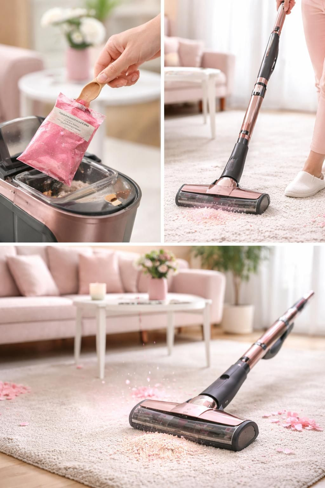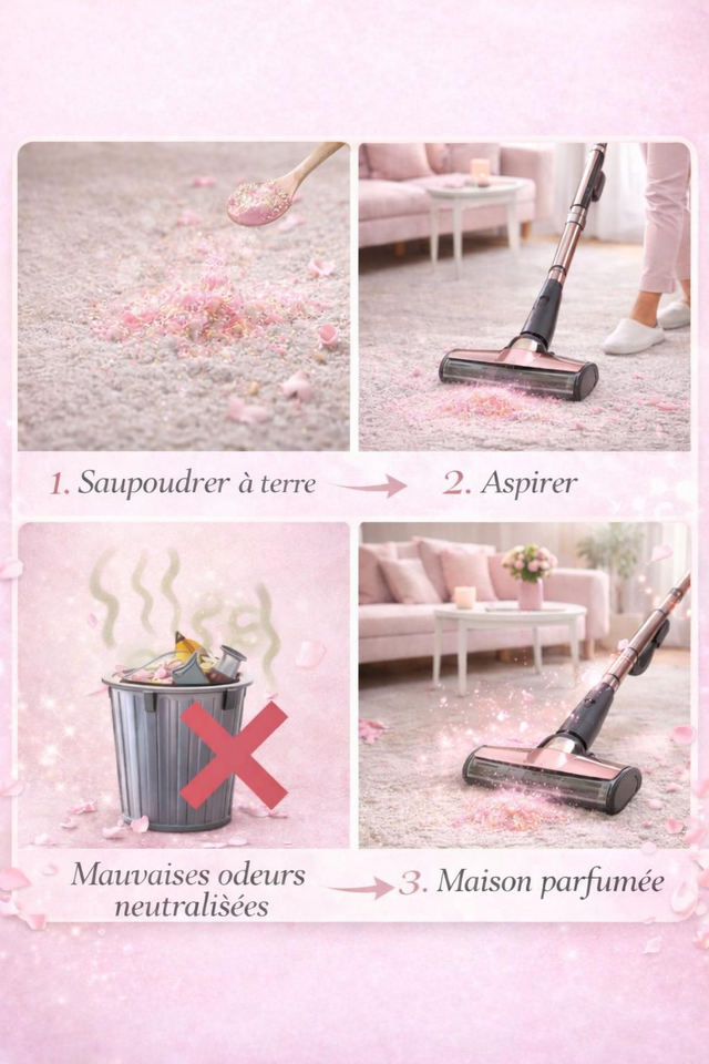 Aspirateur : déposer une cuillère de poudre parfumé sur le sol, aspirer la poudre et passer l'aspirateur.