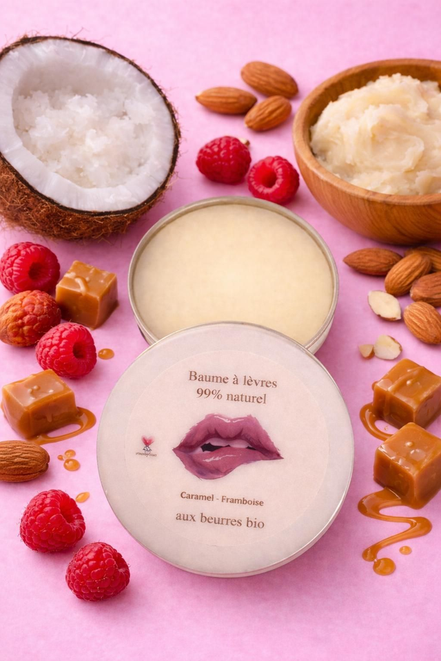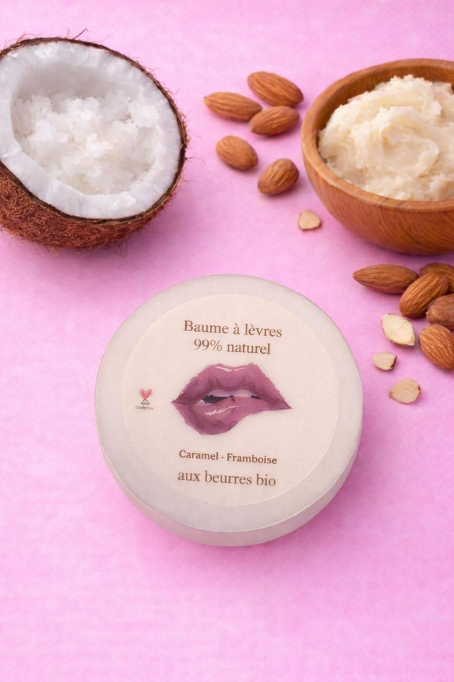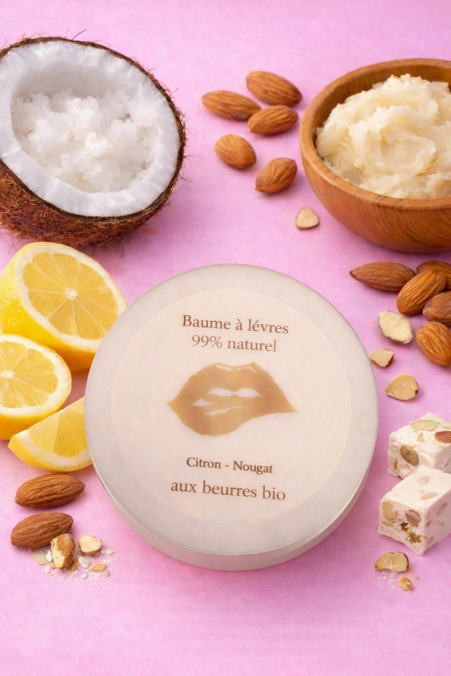 Baume à lèvres aux beurres Bio (huile de coco, huile d'amande douce) et cire d'abeille.